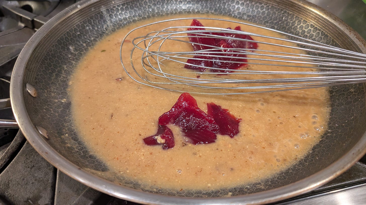 Slow whisk in beef stock and bring to a simmer to thicken. Whisk in mustard and cranberry. Whisk vigorously to dissolve cranberry sauce.