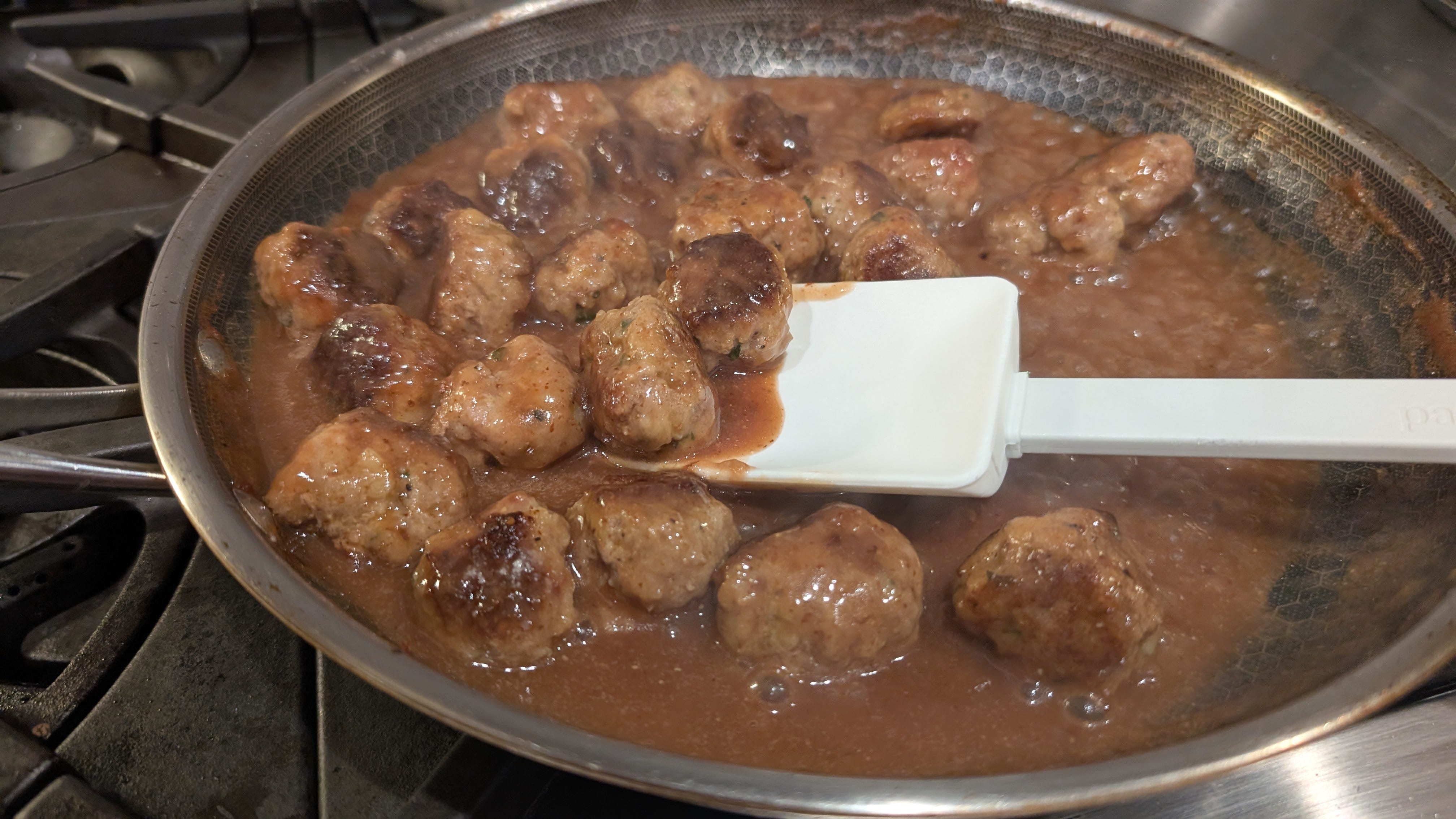 Cook meatballs in skillet and remove when cooked through (165˚F in the center). Turn heat on skillet to medium-low and add butter. As butter melts, scrape up any bits on the skillet. Whisk in flour and let cook for a minute or two.