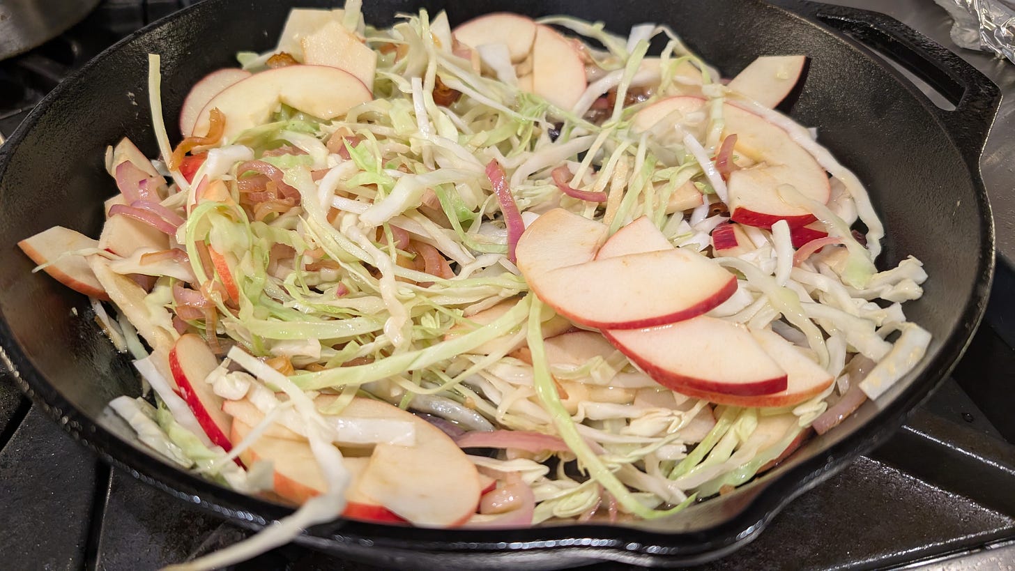 Make the sauce: In the same skillet, reduce heat to medium. Add a bit of butter, then sauté the shallot and apple slices for 2–3 minutes until softened. Add cabbage and dates.